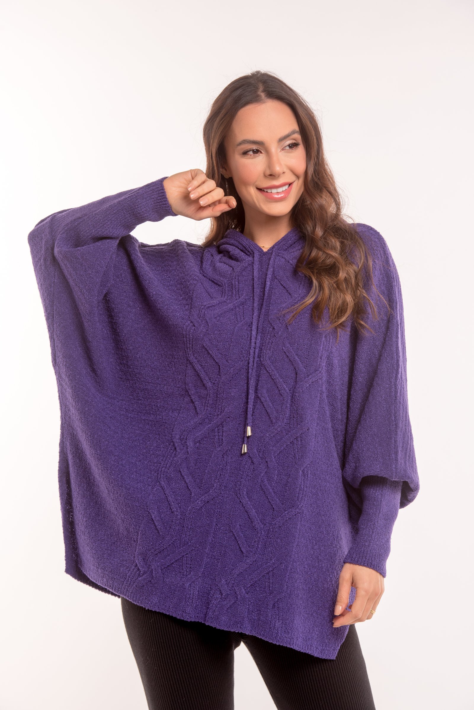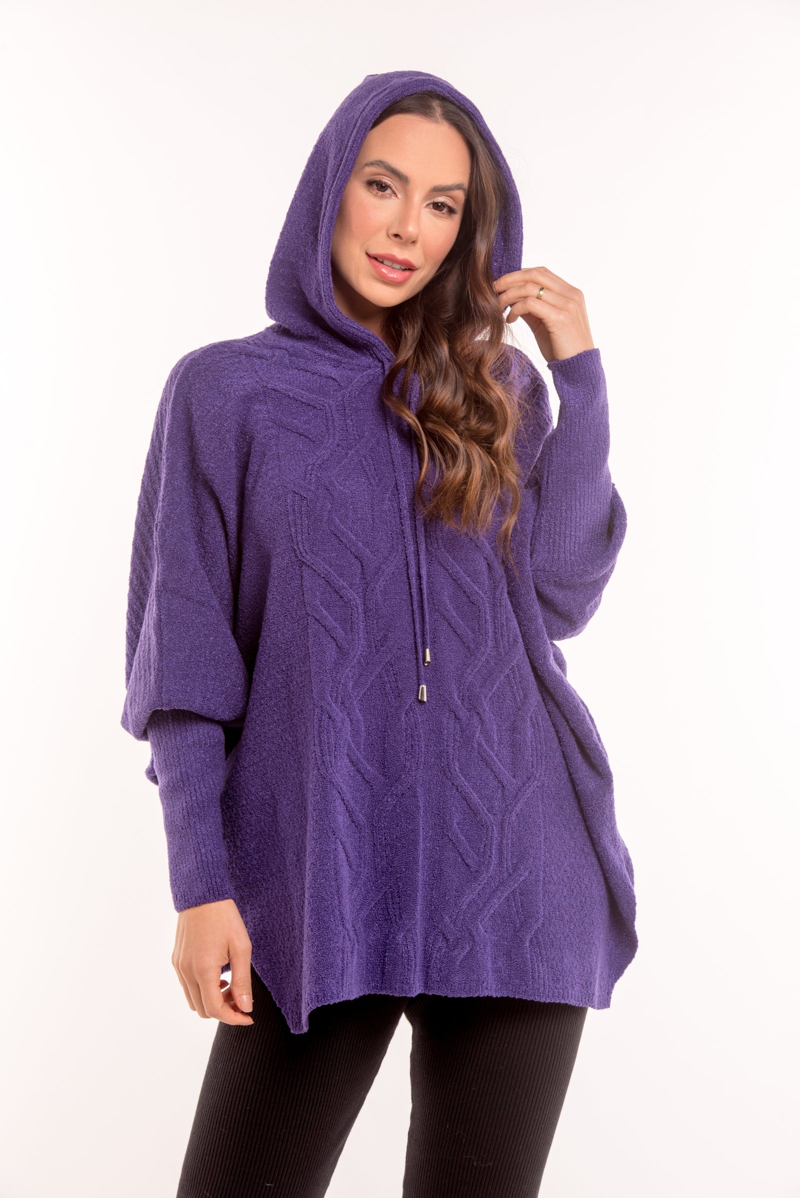 Capa ampla feminina com modelagem ampla e possui capuz.