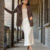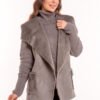 Casaco feminino com modelagem reta, com pele fake na gola e na parte frontal interna, possui bolso também na parte frontal e as costas são confeccionadas em tricô com trabalho trançado.